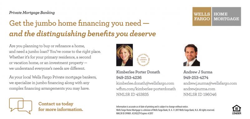 Private MortgageBanking Get the jumbo home financing you need — and the distinguishing benefits you deserve Are you planning to buy or refinance a home, and need a jumbo loan? You’ve come to the right place. Whether it’s for your primary residence, a second or vacation home, or an investment property — we understand everyone’s needs are different. As your local Wells Fargo Private mortgage bankers, we specialize in jumbo financing along with any complex financing arrangements you may have. Kimberlee Porter Donath 949-253-4236 kimberlee.donath@wellsfargo.com wfhm.com/kimberlee-porterdonath NMLSR ID 453835 Andrew J Surma 949-253-4274 andrew.j.surma@wellsfargo.com andrewjsurma.com NMLSR ID 196046 Contact us today for more information. Information is accurate as of date of printing and is subjecttochange without notice. Wells FargoHome Mortgage is adivision ofWells FargoBank, N. A. © 2017Wells FargoBank, N.A. Allrights reserved. NMLSR ID 399801.AS3102279 Expires 4/2017