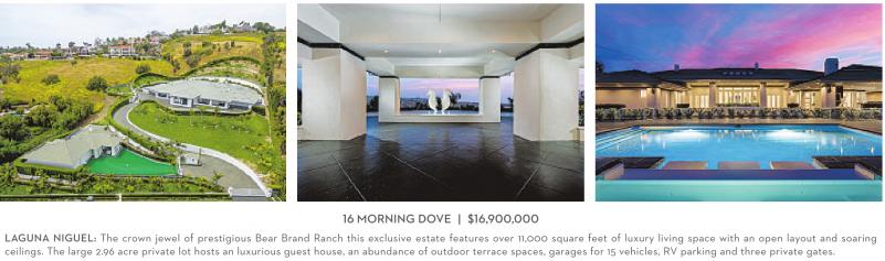 16 MORNING DOVE | $16,900,000 LAGUNA NIGUEL: The crown jewel of prestigious Bear Brand Ranch this exclusive estate features over 11,000 square feet of luxury living space with an open layout and soaring ceilings. The large 2.96 acre private lot hosts an luxurious guest house, an abundance of outdoor terrace spaces, garages for 15 vehicles, RV parking and three private gates.