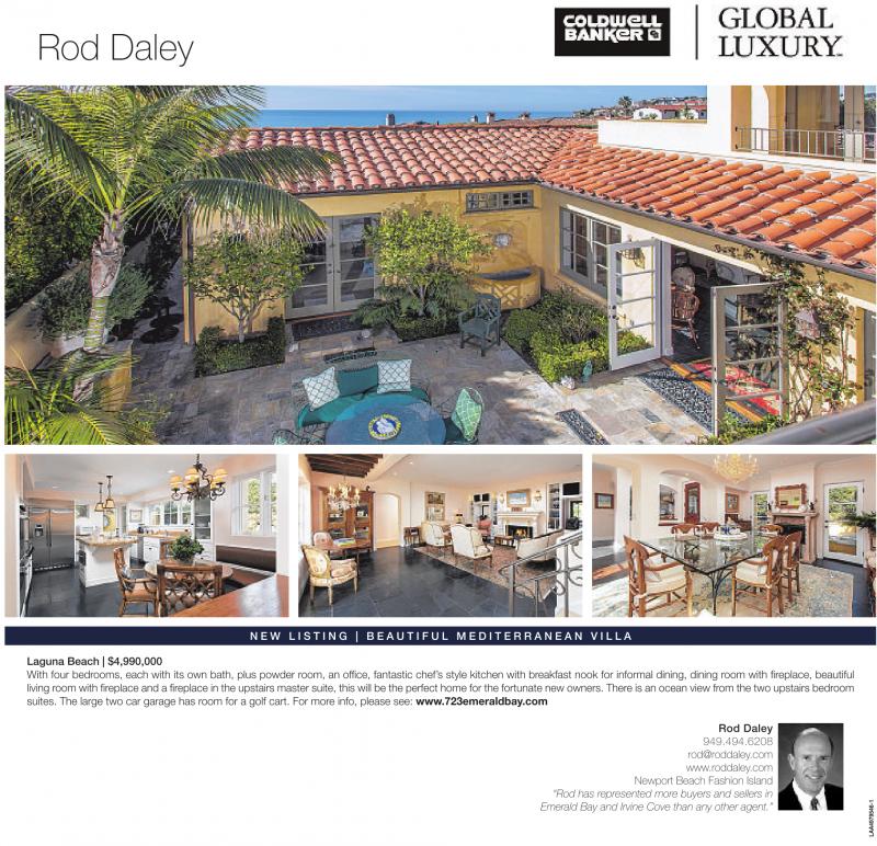 Rod Daley N E W L I S T I N G | B E A U T I F U L M E D I T E R R A N E A N V I L L A Laguna Beach | $4,990,000 With four bedrooms, each with its own bath, plus powder room, an office, fantastic chef’s style kitchen with breakfast nook for informal dining, dining room with fireplace, beautiful living room with fireplace and a fireplace in the upstairs master suite, this will be the perfect home for the fortunate new owners. There is an ocean view from the two upstairs bedroom suites. The large two car garage has room for a golf cart. For more info, please see: www.723emeraldbay.com Rod Daley 949.494.6208 rod@roddaley.com www.roddaley.com Newport Beach Fashion Island “Rod has represented more buyers and sellers in Emerald Bay and Irvine Cove than any other agent.”