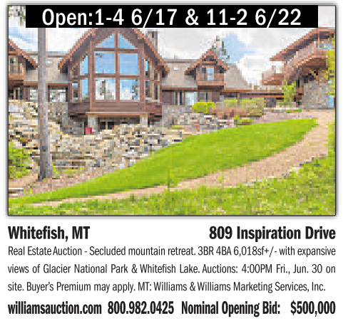 Open:1-4 6/17 & 11-2 6/22 Whitefish, MT 809 InspirationDrive Real EstateAuction -Secluded mountainretreat.3BR4BA 6,018sf+/-withexpansive views of Glacier National Park &Whitefish Lake. Auctions: 4:00PM Fri.,Jun. 30 on site. Buyer’sPremiummay apply.MT: Williams &Williams Marketing Services,Inc. williamsauction.com 800.982.0425 NominalOpening Bid: $500,000