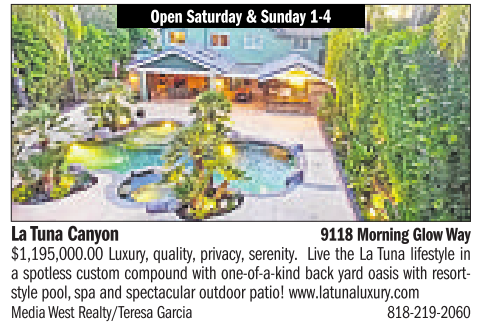 Open Saturday &Sunday 1-4 La Tuna Canyon 9118 Morning Glow Way $1,195,000.00 Luxury,quality,privacy,serenity. Live the La Tuna lifestyle in aspotless custom compound with one-of-a-kind back yard oasis with resortstyle pool, spa and spectacular outdoor patio! www.latunaluxury.com Media West Realty/Teresa Garcia 818-219-2060