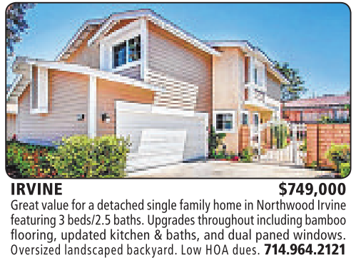 IRVINE $749,000 Great valuefor adetachedsinglefamilyhome in Northwood Irvine featuring 3beds/2.5baths.Upgrades throughoutincluding bamboo flooring, updated kitchen &baths, and dual paned windows. Oversized landscaped backyard. Low HOA dues. 714.964.2121