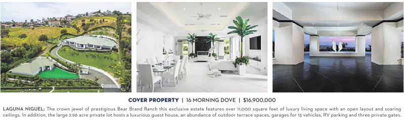 COVER PROPERTY | 16 MORNING DOVE | $16,900,000 LAGUNA NIGUEL: The crown jewel of prestigious Bear Brand Ranch this exclusive estate features over 11,000 square feet of luxury living space with an open layout and soaring ceilings. In addition, the large 2.96 acre private lot hosts a luxurious guest house, an abundance of outdoor terrace spaces, garages for 15 vehicles, RV parking and three private gates.