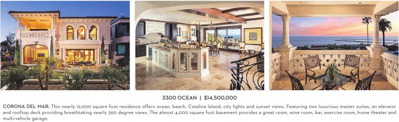 CORONA DEL MAR: This nearly 12,000 square foot residence offers ocean, beach, Catalina Island, city lights and sunset views. Featuring two luxurious master suites, an elevator and rooftop deck providing breathtaking nearly 360 degree views. The almost 4,000 square foot basement provides a great room, wine room, bar, exercise room, home theater and multi-vehicle garage.