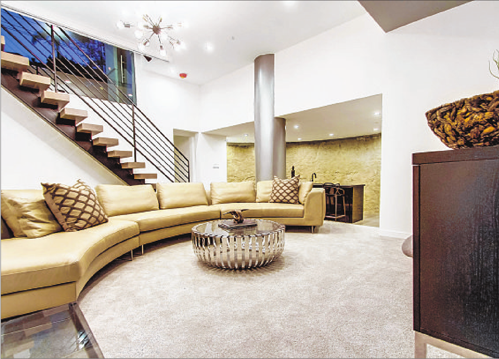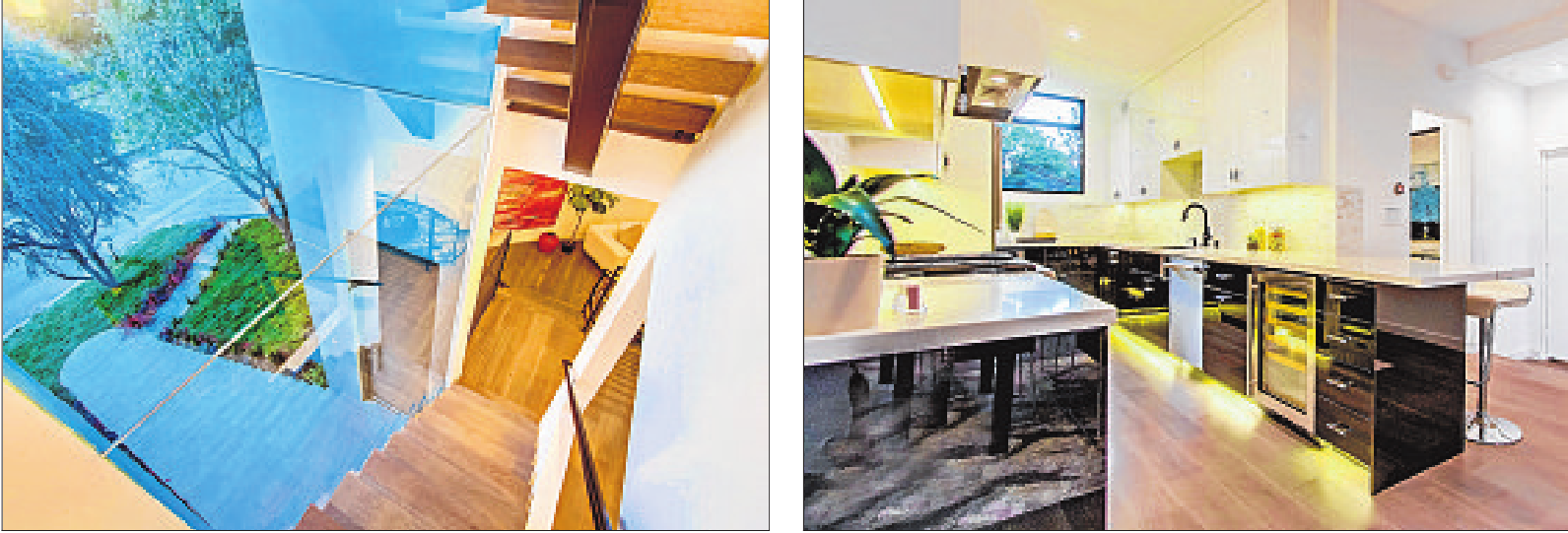 Features: Walls of glass; hardwood and Travertine floors; vaulted ceilings; four-story floating steel staircase; elevator; openplan common rooms; galley-style kitchen with wine cooler and breakfast bar; top-floor master suite; patio with curved bench seating; formal landscaping