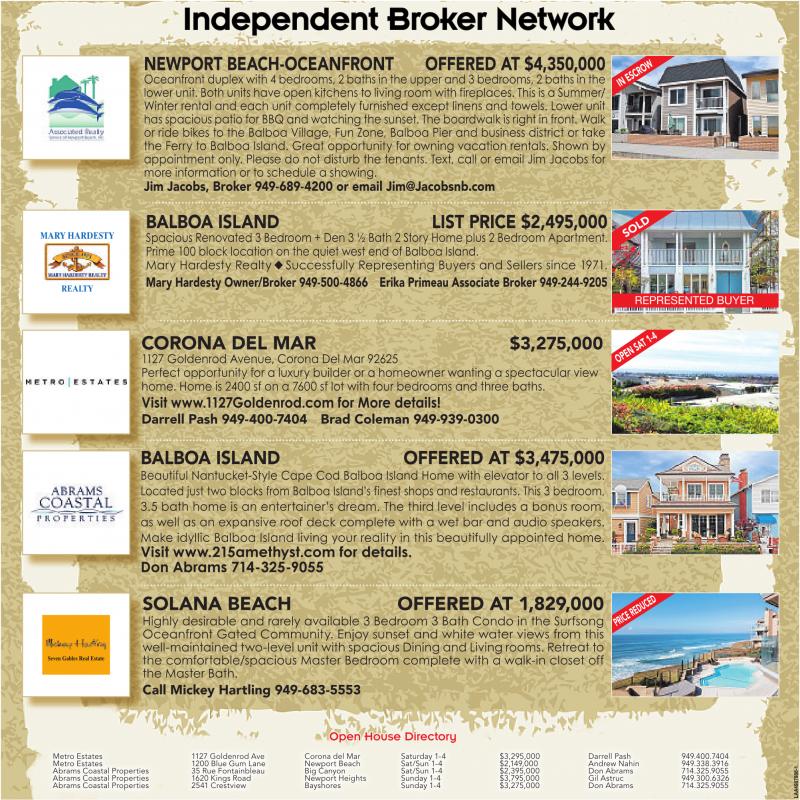 Metro Estates 1127 Goldenrod Ave Corona del Mar Saturday 1-4 $3,295,000 Darrell Pash 949.400.7404 Metro Estates 1200 Blue Gum Lane Newport Beach Sat/Sun 1-4 $2,149,000 Andrew Nahin 949.338.3916 Abrams Coastal Properties 35Rue Fontainbleau Big Canyon Sat/Sun 1-4 $2,395,000 Don Abrams 714.325.9055 Abrams Coastal Properties 1620 Kings Road Newport Heights Sunday 1-4 $3,795,000 Gil Astruc 949.300.6326 Abrams Coastal Properties 2541 Crestview Bayshores Sunday 1-4 $3,275,000 Don Abrams 714.325.9055
