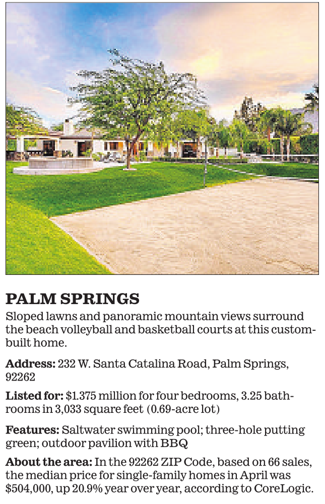 PALM SPRINGS Sloped lawns and panoramic mountain views surround the beach volleyball and basketball courts at this custombuilt home. Address: 232 W. Santa Catalina Road, Palm Springs, 92262 Listed for: $1.375 million for four bedrooms, 3.25 bathrooms in 3,033 square feet (0.69-acre lot) Features: Saltwater swimming pool; three-hole putting green; outdoor pavilion with BBQ About the area: In the 92262 ZIP Code, based on 66 sales, the median price for single-family homes in April was $504,000, up 20.9% year over year, according to CoreLogic.