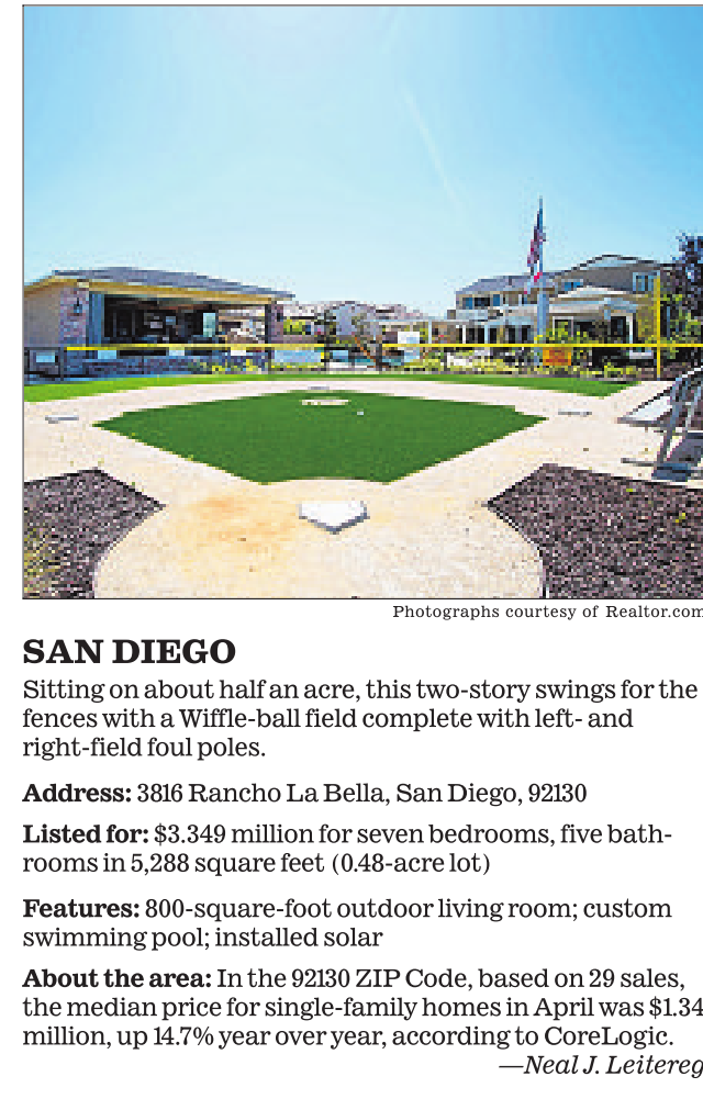 Photographs courtesy of Realtor.com SAN DIEGO Sitting on about half an acre, this two-story swings for the fences with a Wiffle-ball field complete with left- and right-field foul poles. Address: 3816 Rancho La Bella, San Diego, 92130 Listed for: $3.349 million for seven bedrooms, five bathrooms in 5,288 square feet (0.48-acre lot) Features: 800-square-foot outdoor living room; custom swimming pool; installed solar About the area: In the 92130 ZIP Code, based on 29 sales, the median price for single-family homes in April was $1.34 million, up 14.7% year over year, according to CoreLogic. —Neal J. Leitereg