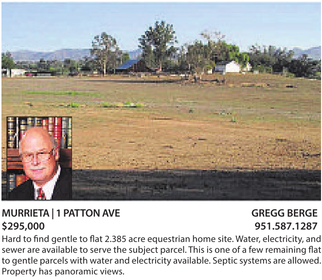 $295,000 951.587.1287 Hardtofind gentle to flat 2.385 acreequestrian home site. Water, electricity, and sewer areavailable to serve the subjectparcel. This is one of afew remaining flat
