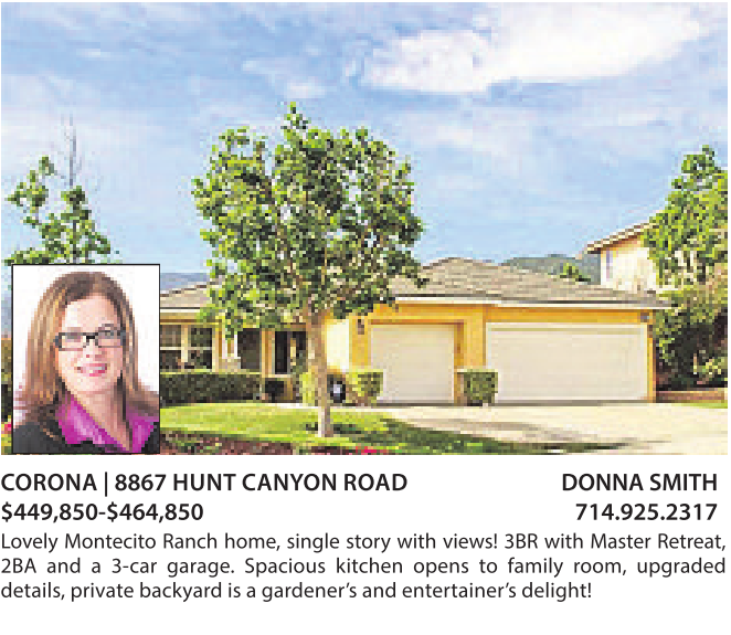 CORONA |8867 HUNT CANYON ROAD $449,850-$464,850 714.925.2317 Lovely Montecito Ranch home, single story with views! 3BR with Master Retreat, 2BA and a 3-car garage. Spacious kitchen opens to family room, upgraded details,private backyardisagardener’s andentertainer’s delight! DONNA SMITH