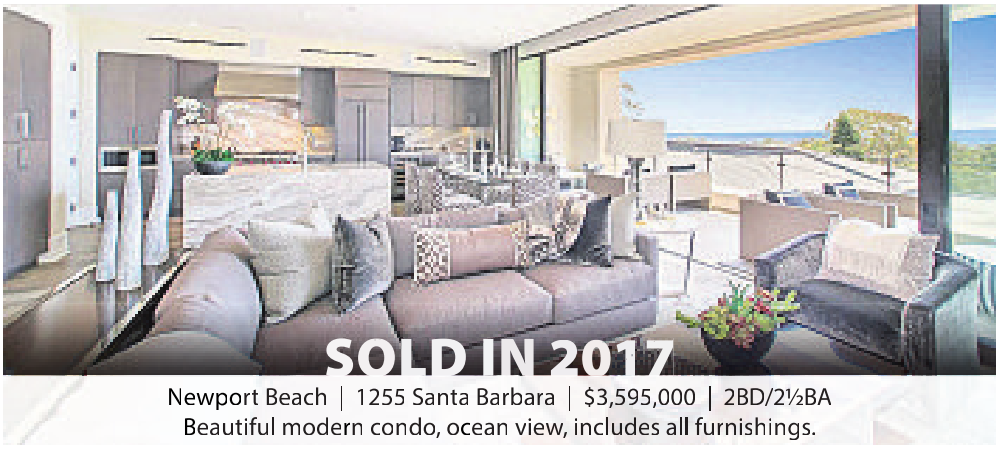 Newport Beach | 1255 Santa Barbara | $3,595,000 | 2BD/2½BA Beautiful modern condo, ocean view, includes all furnishings.
