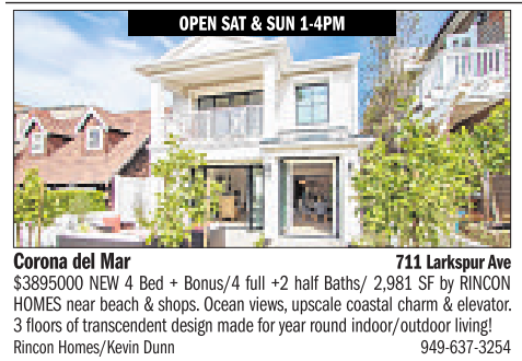 OPEN SAT&SUN 1-4PM Corona del Mar 711 LarkspurAve $3895000 NEW 4Bed +Bonus/4 full +2 half Baths/ 2,981 SF by RINCON HOMES near beach &shops. Ocean views, upscale coastal charm &elevator. 3 floors of transcendent design made for year round indoor/outdoor living! Rincon Homes/Kevin Dunn 949-637-3254 See also