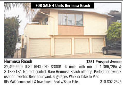 FORSALE 4Units Hermosa Beach Hermosa Beach 1251 Prospect Avenue $2,499,999 JUST REDUCED $300K! 4 units with mix of 1-3BR/2BA & 3-1BR/1BA. No rent control. Rare HermosaBeach offering.Perfect for owner/ user or investor.Rearcourtyard. 4garages.Walk or bike to Pier. RE/MAXCommercial&Investment Realty/BrianEstes 310-802-2525