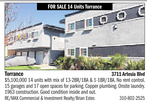 FORSALE 14 Units Torrance Torrance 3711 Artesia Blvd $5,100,000 14 units with mix of 13-2BR/1BA &1-1BR/1BA. No rent control. 15 garages and 17 open spaces for parking.Copper plumbing.Onsite laundry. 1963 construction. Good condition inside and out. RE/MAXCommercial&Investment Realty/Brian Estes 310-802-2525