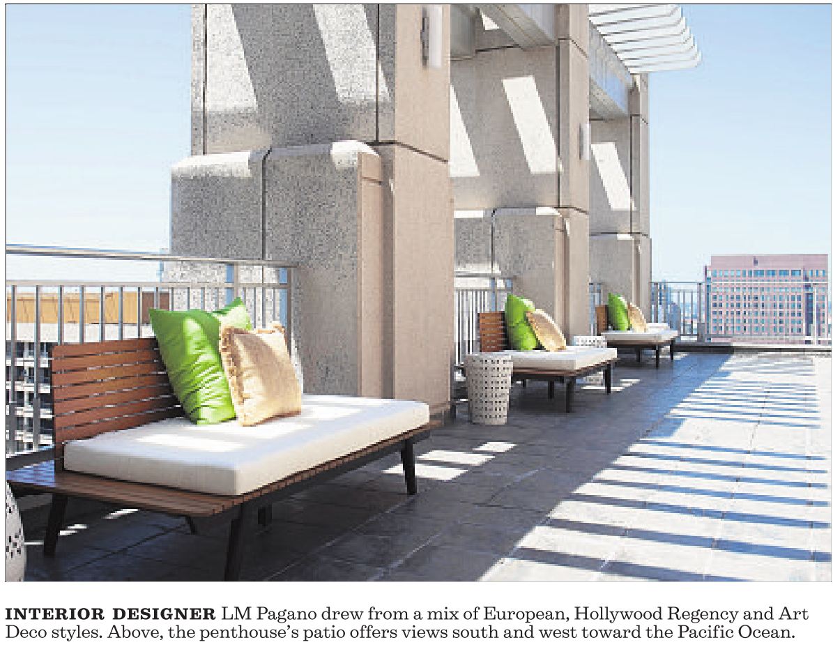 INTERIOR DESIGNER LM Pagano drew from a mix of European, Hollywood Regency and Art Deco styles. Above, the penthouse’s patio offers views south and west toward the Pacific Ocean.