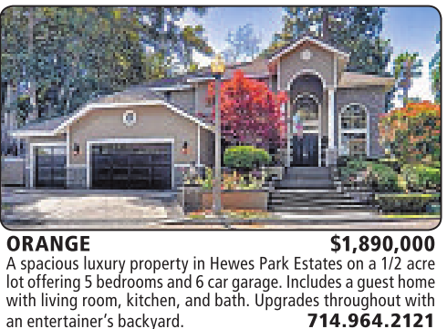 ORANGE $1,890,000 Aspacious luxury property inHewes ParkEstates on a1/2 acre lotoffering 5bedrooms and6car garage.Includes aguest home with living room, kitchen,and bath. Upgrades throughoutwith an entertainer’s backyard. 714.964.2121