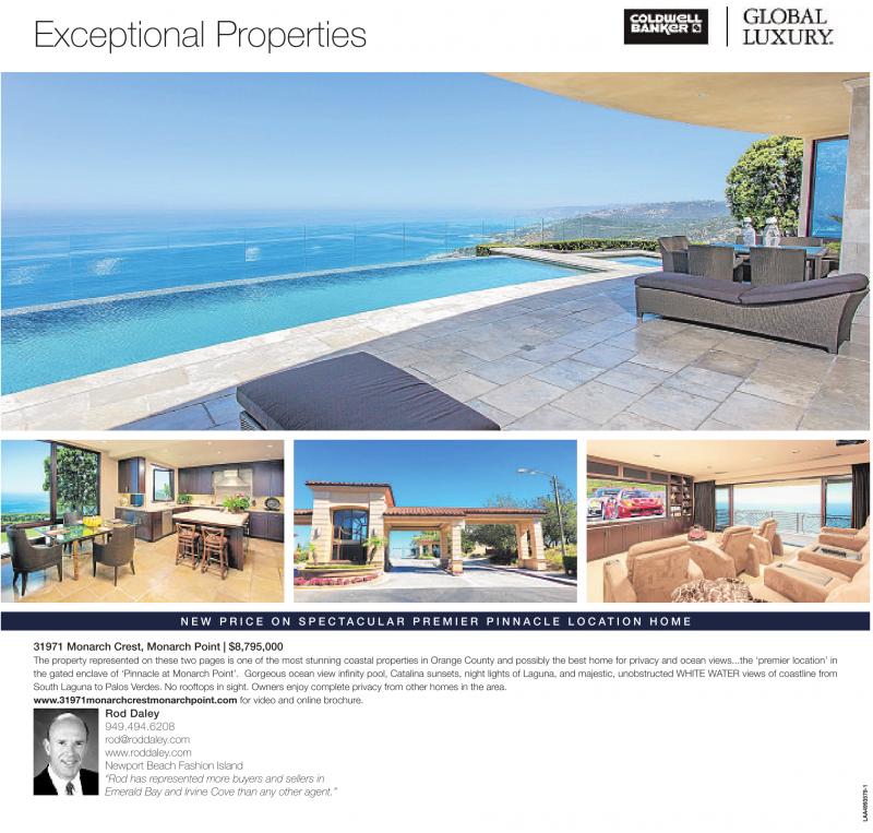 31971 Monarch Crest, Monarch Point | $8,795,000 The property represented on these two pages is one of the most stunning coastal properties in Orange County and possibly the best home for privacy and ocean views...the ‘premier location’ in the gated enclave of ‘Pinnacle at Monarch Point’. Gorgeous ocean view infinity pool, Catalina sunsets, night lights of Laguna, and majestic, unobstructed WHITE WATER views of coastline from South Laguna to Palos Verdes. No rooftops in sight. Owners enjoy complete privacy from other homes in the area. www.31971monarchcrestmonarchpoint.com for video and online brochure.