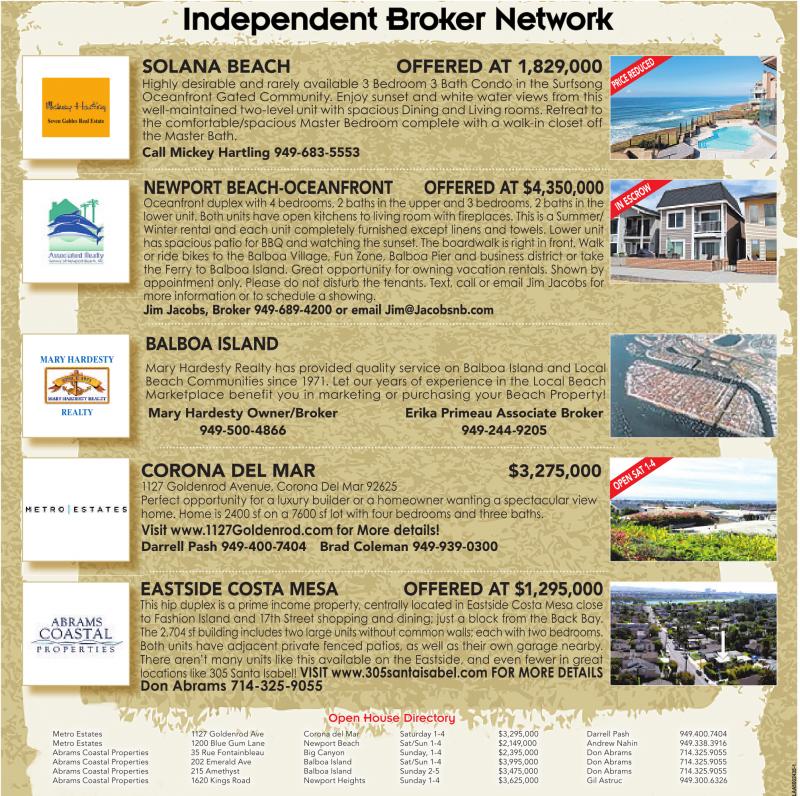 Metro Estates 1127 Goldenrod Ave Corona del Mar Saturday 1-4 $3,295,000 Darrell Pash 949.400.7404 Metro Estates 1200 Blue Gum Lane Newport Beach Sat/Sun 1-4 $2,149,000 Andrew Nahin 949.338.3916 Abrams Coastal Properties 35Rue Fontainbleau Big Canyon Sunday, 1-4 $2,395,000 Don Abrams 714.325.9055 Abrams Coastal Properties 202 Emerald Ave Balboa Island Sat/Sun 1-4 $3,995,000 Don Abrams 714.325.9055 Abrams Coastal Properties 215 Amethyst Balboa Island Sunday 2-5 $3,475,000 Don Abrams 714.325.9055 Abrams Coastal Properties 1620 Kings Road Newport Heights Sunday 1-4 $3,625,000 Gil Astruc 949.300.6326