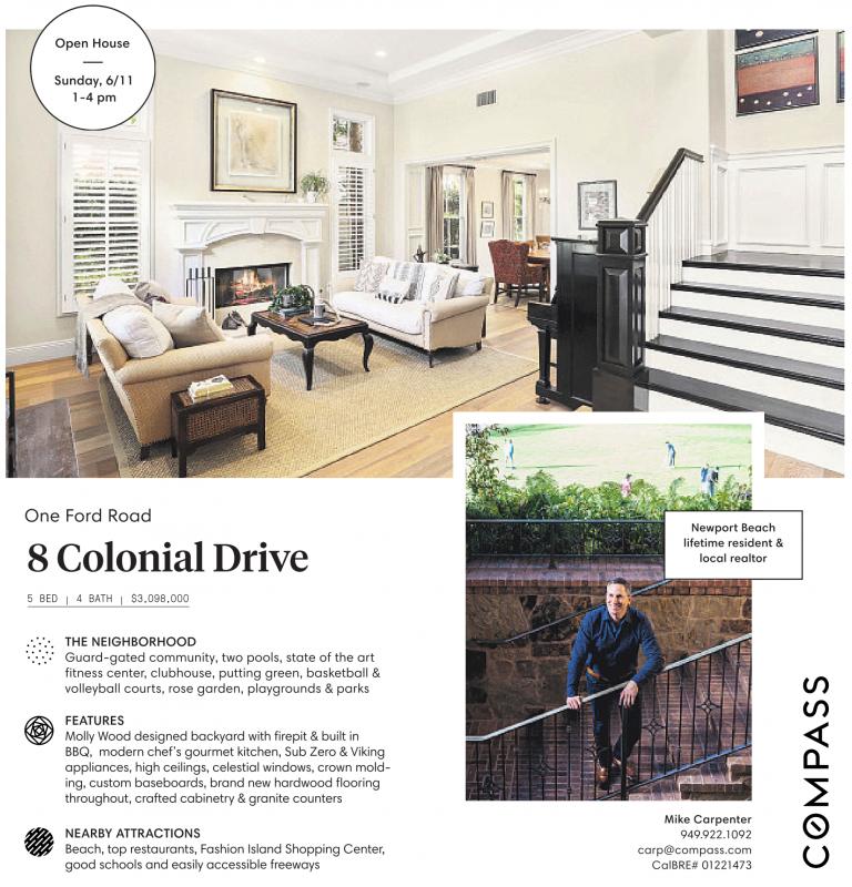 Open House Sunday, 6/11 1-4 pm One Ford Road 8 Colonial Drive 5 BED | 4 BATH | $3,098,000 THE NEIGHBORHOOD Guard-gated community, two pools, state of the art fitness center, clubhouse, putting green, basketball & volleyball courts, rose garden, playgrounds & parks FEATURES BBQ, modern chef’s gourmet kitchen, Sub Zero & Viking appliances, high ceilings, celestial windows, crown mold- throughout, crafted cabinetry & granite counters NEARBY ATTRACTIONS Beach, top restaurants, Fashion Island Shopping Center, good schools and easily accessible freeways Newport Beach lifetime resident & local realtor Mike Carpenter 949.922.1092 carp@compass.com CalBRE# 01221473
