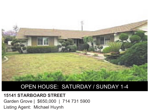 OPEN HOUSE: SATURDAY / SUNDAY 1-4 15141 STARBOARD STREET Garden Grove | $650,000 | 714 731 5900 Listing Agent: Michael Huynh