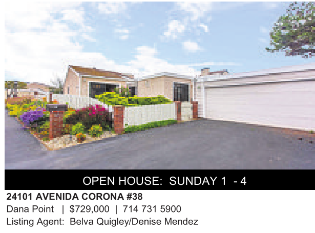 OPEN HOUSE: SUNDAY 1 - 4 24101 AVENIDA CORONA #38 Dana Point | $729,000 | 714 731 5900 Listing Agent: Belva Quigley/Denise Mendez