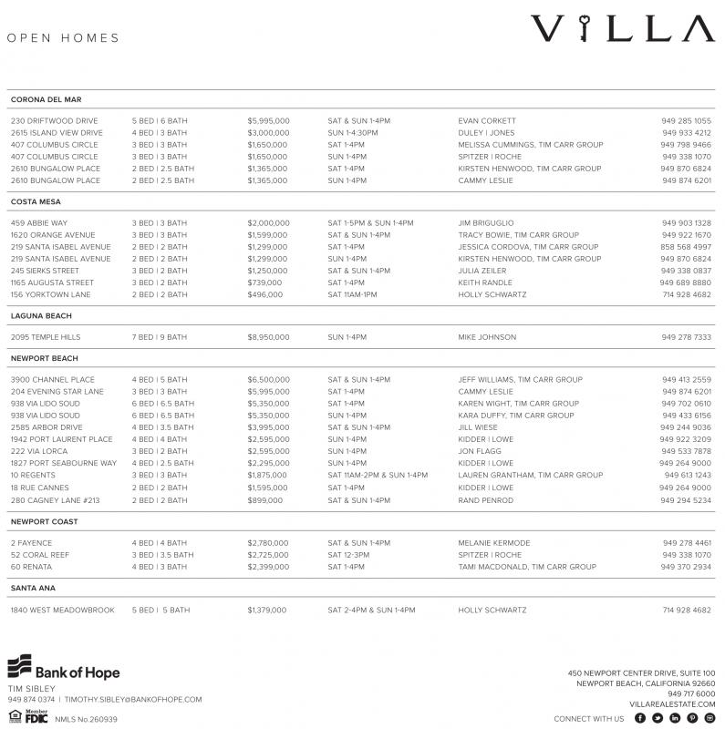 3900 CHANNEL PLACE 4 BED | 5 BATH $6,500,000 SAT & SUN 1-4PM JEFF WILLIAMS, TIM CARR GROUP 949 413 2559 204 EVENING STAR LANE 3 BED | 3 BATH $5,995,000 SAT 1-4PM CAMMY LESLIE 949 874 6201 938 VIA LIDO SOUD 6 BED | 6.5 BATH $5,350,000 SAT 1-4PM KAREN WIGHT, TIM CARR GROUP 949 702 0610 938 VIA LIDO SOUD 6 BED | 6.5 BATH $5,350,000 SUN 1-4PM KARA DUFFY, TIM CARR GROUP 949 433 6156 2585 ARBOR DRIVE 4 BED | 3.5 BATH $3,995,000 SAT & SUN 1-4PM JILL WIESE 949 244 9036 1942 PORT LAURENT PLACE 4 BED | 4 BATH $2,595,000 SUN 1-4PM KIDDER | LOWE 949 922 3209 222 VIA LORCA 3 BED | 2 BATH $2,595,000 SUN 1-4PM JON FLAGG 949 533 7878 1827 PORT SEABOURNE WAY 4 BED | 2.5 BATH $2,295,000 SUN 1-4PM KIDDER | LOWE 949 264 9000 10 REGENTS 3 BED | 3 BATH $1,875,000 SAT 11AM-2PM & SUN 1-4PM LAUREN GRANTHAM, TIM CARR GROUP 949 613 1243 18 RUE CANNES 2 BED | 2 BATH $1,595,000 SAT 1-4PM KIDDER | LOWE 949 264 9000 280 CAGNEY LANE #213 2 BED | 2 BATH $899,000 SAT & SUN 1-4PM RAND PENROD 949 294 5234