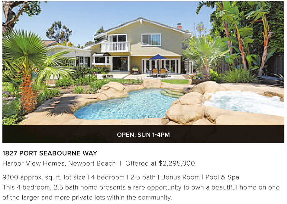 OPEN: SUN 1-4PM 1827 PORT SEABOURNE WAY Harbor View Homes, Newport Beach | Offered at $2,295,000 9,100 approx. sq. ft. lot size | 4 bedroom | 2.5 bath | Bonus Room | Pool & Spa This 4 bedroom, 2.5 bath home presents a rare opportunity to own a beautiful home on one of the larger and more private lots within the community. See also