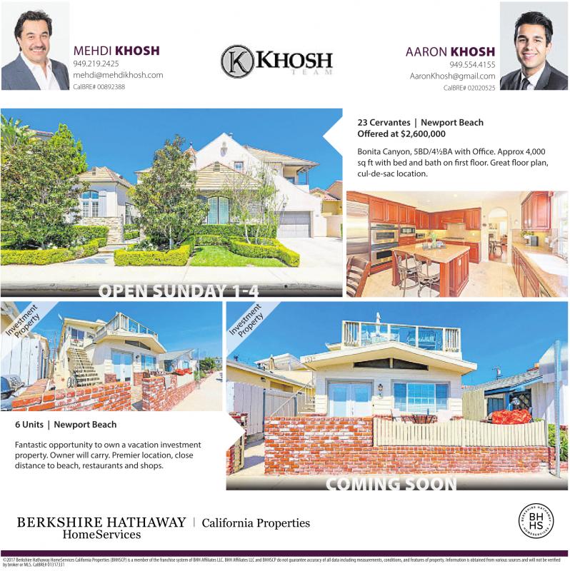 MEHDI KHOSH 949.219.2425 mehdi@mehdikhosh.com CalBRE# 00892388 AARON KHOSH 949.554.4155 AaronKhosh@gmail.com CalBRE# 02020525 23 Cervantes | Newport Beach Offered at $2,600,000 Bonita Canyon, 5BD/4½BA with Office. Approx 4,000 sq ft with bed and bath on first floor. Great floor plan, cul-de-sac location. OPEN SUNDAY 1-4 6 Units | Newport Beach Fantastic opportunity to own a vacation investment property. Owner will carry. Premier location, close distance to beach, restaurants and shops. COMING SOON ©2017BerkshireHathawayHomeServicesCaliforniaProperties(BHHSCP)isamemberofthefranchisesystemofBHHAffiliatesLLC.BHHAffiliatesLLCandBHHSCPdonotguaranteeaccuracyofalldataincludingmeasurements,conditions,andfeaturesofproperty.Informationisobtainedfromvarioussourcesandwillnotbeverified bybroker or MLS. CalBRE# 01317331