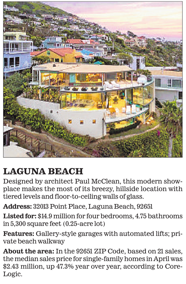 LAGUNA BEACH Designed by architect Paul McClean, this modern showplace makes the most of its breezy, hillside location with tiered levels and floor-to-ceiling walls of glass. Address: 32013 Point Place, Laguna Beach, 92651 Listed for: $14.9 million for four bedrooms, 4.75 bathrooms in 5,300 square feet (0.25-acre lot) Features: Gallery-style garages with automated lifts; private beach walkway About the area: In the 92651 ZIP Code, based on 21 sales, the median sales price for single-family homes in April was $2.43 million, up 47.3% year over year, according to Core- Logic. See also