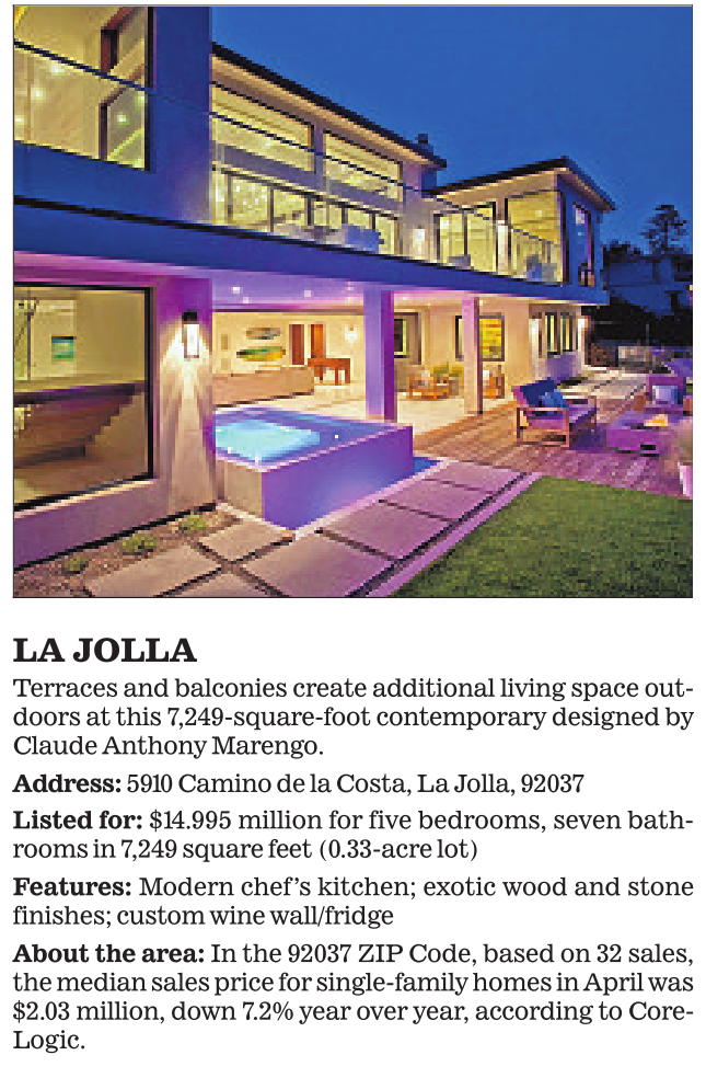 About the area: In the 92037 ZIP Code, based on 32 sales, the median sales price for single-family homes in April was $2.03 million, down 7.2% year over year, according to Core- Logic.
