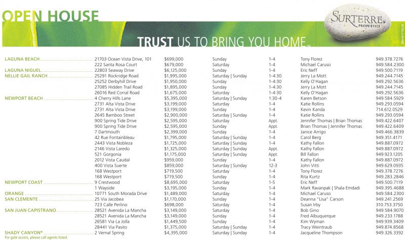 LAGUNA BEACH........................................... 21703 Ocean Vista Drive, 101 $699,000 Sunday 1-4 Tony Florez 949.378.7276 222 Santa Rosa Court $679,000 Saturday 1-4 Michael Caruso 949.584.2300 LAGUNA NIGUEL.......................................... 22803 Seaway Drive $6,125,000 Sunday 1-4 Eric Neff 949.500.7119 NELLIE GAIL RANCH .................................... 25291 Rockridge Road $1,995,000 Saturday | Sunday 1-4:30 Jerry La Mott 949.244.7145 25252 Derbyhill Drive $1,950,000 Sunday 1-4:30 Kelly O'Hagan 949.292.5636 27085 Hidden Trail Road $1,895,000 Sunday 1-4:30 Jerry La Mott 949.244.7145 26016 Red Corral Road $1,675,000 Saturday 1-4:30 Kelly O'Hagan 949.292.5636 NEWPORT BEACH ........................................ 4 Cherry Hills Lane $5,395,000 Saturday | Sunday 1:30-4 Karen Betson 949.584.5929 2731 Alta Vista Drive $3,199,000 Saturday 1-4 Katie Rollins 949.293.0594 2731 Alta Vista Drive $3,199,000 Sunday 1-4 Kevin Kanda 714.612.0529 2645 Bamboo Street $2,900,000 Saturday | Sunday 1-4 Katie Rollins 949.293.0594 900 Spring Tide Drive $2,595,000 Saturday Appt. Jennifer Thomas | Brian Thomas 949.422.6407 900 Spring Tide Drive $2,595,000 Sunday Appt. Brian Thomas | Jennifer Thomas 949.422.6409 7 Dartmouth $2,399,000 Sunday 1-4 Janice Arrigo 949.466.3839 42 Rue Fontainbleau $1,795,000 Saturday | Sunday 1-4 Carol Berg 949.351.4171 2443 Vista Nobleza $1,725,000 Saturday | Sunday 1-4 Kathy Fallon 949.887.0972 2146 Vista Laredo $1,325,000 Saturday | Sunday Appt. Kathy Fallon 949.887.0972 521 Gorgonia $1,175,000 Saturday | Sunday Appt. Bill Fallon 949.923.1205 2012 Vista Caudal $959,000 Sunday 1-4 Kathy Fallon 949.887.0972 400 Vista Suerte $859,000 Saturday | Sunday 12-3 John Vitti 949.629.0935 168 Westport $719,500 Saturday 1-4 Tony Florez 949.378.7276 168 Westport $719,500 Sunday 1-4 Rita Kurtz 949.283.2846 NEWPORT COAST ........................................ 9 Crestwood $8,695,000 Saturday 1-5 Eric Neff 949.500.7119 1 Wayside $3,195,000 Sunday 1-4 Mark Ravanpak | Shala Emdadi 949.395.4688 ORANGE ....................................................... 10771 South Morada Drive $1,489,000 Saturday 1-4 Michael Caruso 949.584.2300 SAN CLEMENTE ............................................ 25 Via Jacobea $1,170,000 Sunday 1-4 Deanna "Lisa" Carson 949.241.2569 723 Calle Perlino $698,000 Saturday 1-4 Susan Irby 310.753.3750 SAN JUAN CAPISTRANO.............................. 28521 Avenida La Mancha $3,149,000 Saturday 1-4 Bob Gino 949.584.9070 28521 Avenida La Mancha $3,149,000 Sunday 1-4 Fred Albuquerque 949.233.1788 26581 Via La Jolla $1,449,500 Sunday 1-4 Kim Wyman 949.939.3409 28441 Via Pasito $1,375,000 Saturday | Sunday 1-4 Tracy Weintraub 949.874.8568 SHADY CANYON ® ........................................ 2 Vernal Spring $4,395,000 Saturday | Sunday 1-4 Jacqueline Thompson 949.326.3392 Forgateaccess,pleasecallagentslisted.
