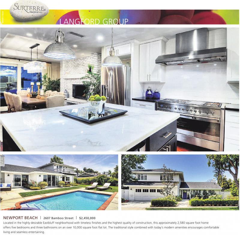 LANGFORD GROUP NEWPORT BEACH | 2607 Bamboo Street | $2,450,000 Located in the highly desirable Eastbluff neighborhood with timeless finishes and the highest quality of construction, this approximately 2,580 square foot home offers five bedrooms and three bathrooms on an over 10,000 square foot flat lot. The traditional style combined with today’s modern amenities encourages comfortable living and seamless entertaining.