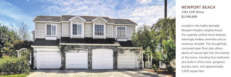 NEWPORT BEACH 1701 Cliff Drive $2,100,000 Located in the highly desirable Newport Heights neighborhood, this superbly crafted home features seemingly endless amenities and an extensive remodel. The thoughtfully conceived open floor plan allows plenty of natural light into the entirety of the home, including four bedrooms plus built-in office nook, gorgeous laundry room, and approximately 2,600 square feet. See also