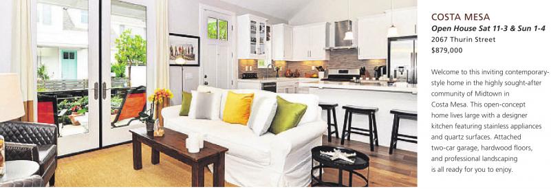 COSTA MESA Open House Sat 11-3 & Sun 1-4 2067 Thurin Street $879,000 Welcome to this inviting contemporarystyle home in the highly sought-after community of Midtown in Costa Mesa. This open-concept home lives large with a designer kitchen featuring stainless appliances and quartz surfaces. Attached two-car garage, hardwood floors, and professional landscaping is all ready for you to enjoy.