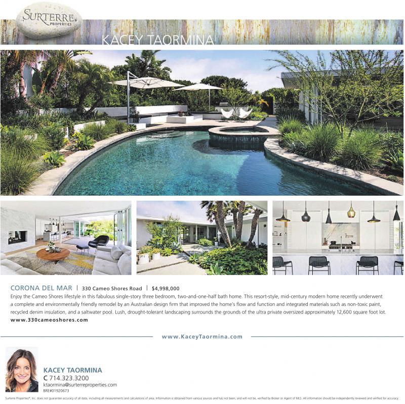 KACEY TAORMINA CORONA DEL MAR | 330 Cameo Shores Road | $4,998,000 Enjoy the Cameo Shores lifestyle in this fabulous single-story three bedroom, two-and-one-half bath home. This resort-style, mid-century modern home recently underwent a complete and environmentally friendly remodel by an Australian design firm that improved the home’s flow and function and integrated materials such as non-toxic paint, recycled denim insulation, and a saltwater pool. Lush, drought-tolerant landscaping surrounds the grounds of the ultra private oversized approximately 12,600 square foot lot. www.330cameoshores.com www.KaceyTaormina.com KACEY TAORMINA C 714.323.3200 ktaormina@surterreproperties.com BRE#01920673 Surterre Properties ® ,Inc. does not guarantee accuracy of all data, including all measurements and calculations ofarea. Information isobtained from various sources and has not been, and will not be, verified by Broker or Agent ofMLS. All information should be independently reviewed and verified for accuracy.
