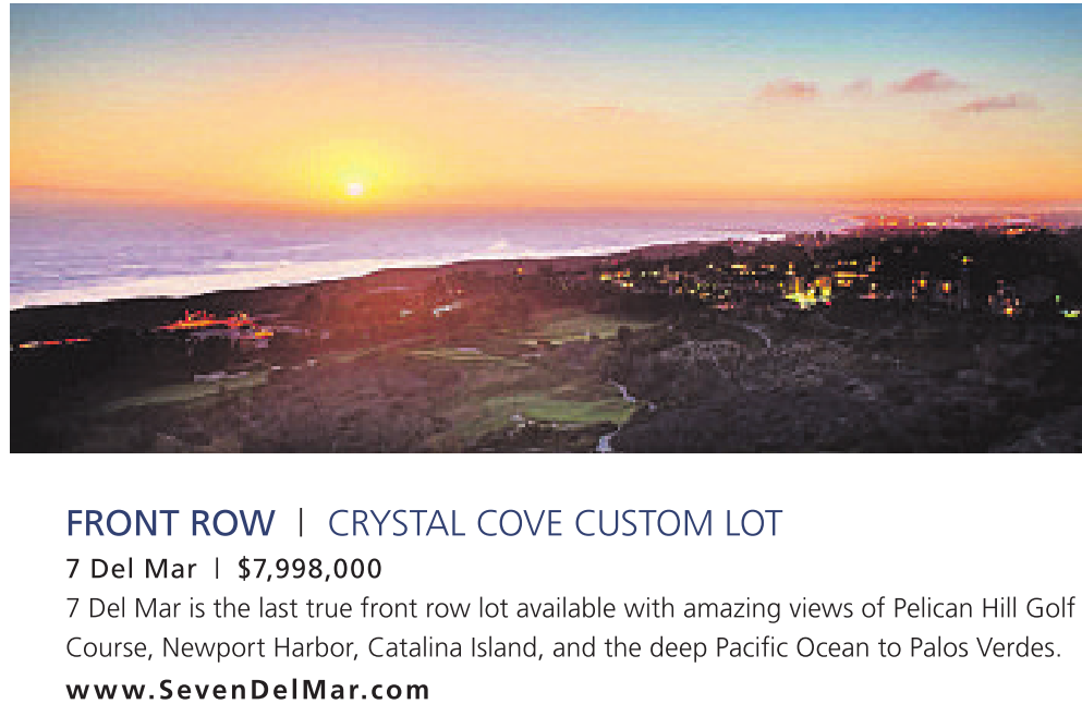 7 Del Mar | $7,998,000 7 Del Mar is the last true front row lot available with amazing views of Pelican Hill Golf Course, Newport Harbor, Catalina Island, and the deep Pacific Ocean to Palos Verdes.