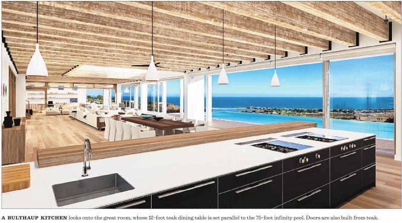 A BULTHAUP KITCHEN looks onto the great room, whose 12-foot teak dining table is set parallel to the 75-foot infinity pool. Doors are also built from teak.