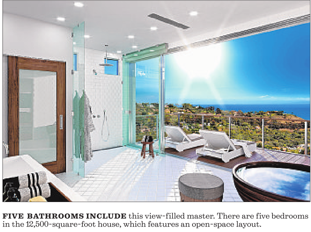 FIVE BATHROOMS INCLUDE this view-filled master. There are five bedrooms in the 12,500-square-foot house, which features an open-space layout.