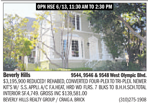 OPN HSE 6/13, 11:30 AM TO 2:30 PM Beverly Hills 9544,9546 &9548 West Olympic Blvd. $3,195,900 REDUCED! REHABED,CONVERTED FOUR-PLEXTO TRI-PLEX.NEWER KIT’S W/ S.S. APPLI. A/C F.A.HEAT,HRD WD FLRS. 7BLKS TO B.H.H.SCH.TOTAL INTERIOR SF.4,749.GROSS INC $139,581.00 BEVERLY HILLSREALTY GROUP /CRAIG A. BRICK (310)275-1908