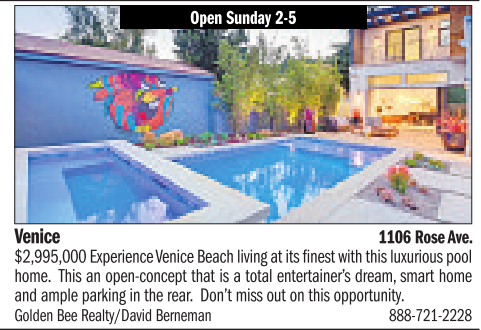Open Sunday 2-5 Venice 1106 Rose Ave. $2,995,000 ExperienceVenice Beach livingatits finest with this luxuriouspool home. This an open-concept that is atotal entertainer’sdream, smarthome andample parking in the rear. Don’t miss out on this opportunity. Golden Bee Realty/DavidBerneman 888-721-2228