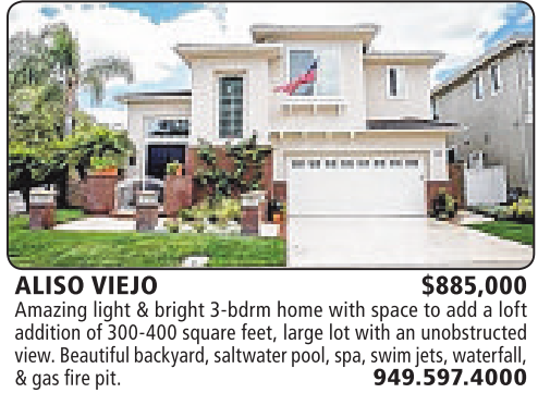 ALISO VIEJO $885,000 Amazing light &bright 3-bdrm home with space toadd aloft addition of 300-400 square feet, large lot with an unobstructed view.Beautifulbackyard,saltwater pool,spa,swimjets, waterfall, &gas fire pit. 949.597.4000