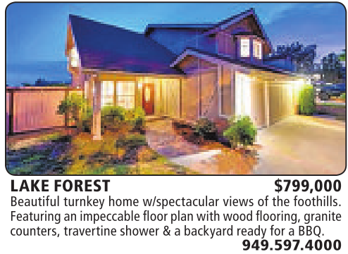 LAKE FOREST $799,000 Beautiful turnkey home w/spectacular views ofthe foothills. Featuringanimpeccable floorplanwithwood flooring,granite counters, travertineshower&abackyard readyfor aBBQ.