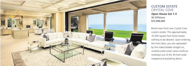 CUSTOM ESTATE CRYSTAL COVE Open House Sat 1-5 35 Offshore $15,998,000 Brand-new front row Crystal Cove custom estate. This approximately 10,393 square foot home leaves nothing to be desired. Upon entering the front door, you are captivated by the indescribable straight on, unobstructed ocean views (without rooftops) out of the 30-foot-wide wraparound pocketing doors.
