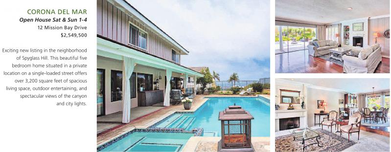 CORONA DEL MAR Open House Sat & Sun 1-4 12 Mission Bay Drive $2,549,500 Exciting new listing in the neighborhood of Spyglass Hill. This beautiful five bedroom home situated in a private location on a single-loaded street offers over 3,200 square feet of spacious living space, outdoor entertaining, and spectacular views of the canyon and city lights.