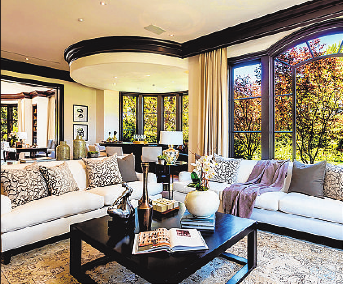 Common areas include a blackand-white mosaic foyer that opens to a formal living room, an adjacent dining room and an openplan kitchen. A two-sided fireplace serves as a divider between the common areas.