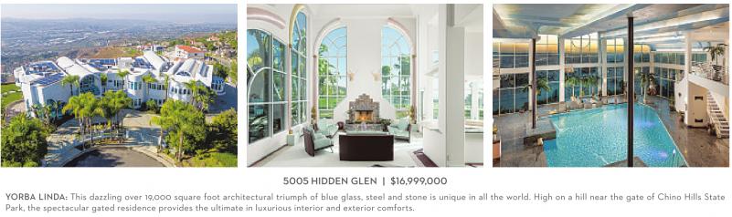 YORBA LINDA: This dazzling over 19,000 square foot architectural triumph of blue glass, steel and stone is unique in all the world. High on a hill near the gate of Chino Hills State Park, the spectacular gated residence provides the ultimate in luxurious interior and exterior comforts.