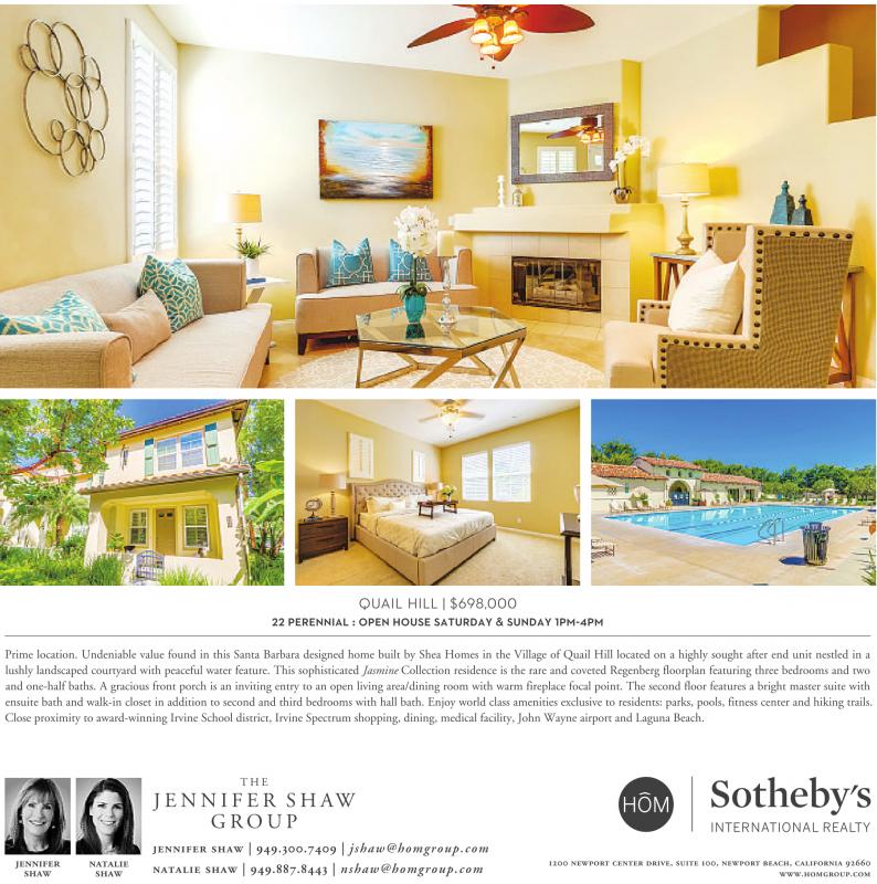 QUAIL HILL | $698,000 22 perennial : open house saturday & sunday 1pm-4pm Prime location. Undeniable value found in this Santa Barbara designed home built by Shea Homes in the Village of Quail Hill located on a highly sought after end unit nestled in a lushly landscaped courtyard with peaceful water feature. This sophisticated Jasmine Collection residence is the rare and coveted Regenberg floorplan featuring three bedrooms and two and one-half baths. A gracious front porch is an inviting entry to an open living area/dining room with warm fireplace focal point. The second floor features a bright master suite with ensuite bath and walk-in closet in addition to second and third bedrooms with hall bath. Enjoy world class amenities exclusive to residents: parks, pools, fitness center and hiking trails. Close proximity to award-winning Irvine School district, Irvine Spectrum shopping, dining, medical facility, John Wayne airport and Laguna Beach. jennifer shaw natalie shaw jennifer shaw | 949.300.7409 | jshaw@homgroup.com natalie shaw | 949.887.8443 | nshaw@homgroup.com 1200 newport center drive, suite 100, newport beach, california 92660 www.homgroup.com