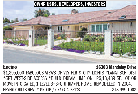 Encino 16303 Mandalay Drive $1,895,000 FABULOUS VIEWS OF VLY FLR & CITY LIGHTS *LANAI SCH DIST *GRT WEST-SIDE ACCESS *BUILD DREAM HME ON LRG,13,489 SF. LOT OR MOVE INTOGATED,1LEVEL 3+3+GRT RM+PL HOME REMODELED IN 2004. BEVERLYHILLSREALTY GROUP /CRAIG A.BRICK 818-995-1908