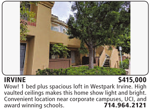 IRVINE $415,000 Wow! 1 bed plus spacious loft in Westpark Irvine. High vaulted ceilings makesthis home show lightand bright. Convenient location near corporatecampuses, UCI, and awardwinningschools. 714.964.2121