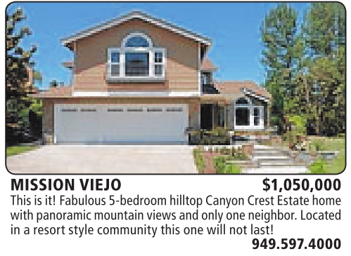 MISSION VIEJO $1,050,000 This is it!Fabulous5-bedroom hilltopCanyonCrest Estate home with panoramicmountain viewsand only oneneighbor. Located in aresortstyle community this onewillnot last!